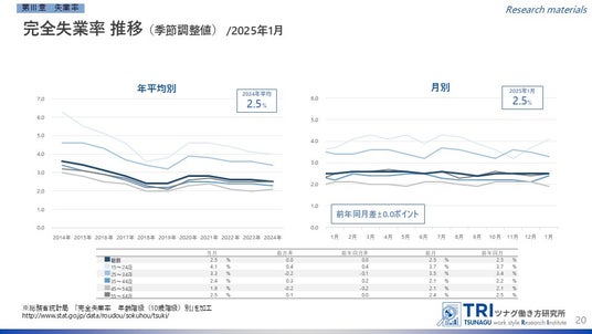 株式会社ツナググループ・ホールディングス(本社:東京都中央区、代表取締役社長:米田 光宏)を母体とする、多様な働き方の調査研究機関「ツナグ働き方研究所(拠点:東京都中央区、所長:大野 博司)」は、官公庁などが発表する労働市場関連のデータをキュレーションしつつ、分かりやすくまとめた「労働市場データレポート」を毎月発表しています。今回は3月上旬に発表された最新データをもとに2025年1月度のレポートについて、とりまとめましたのでご報告いたします。