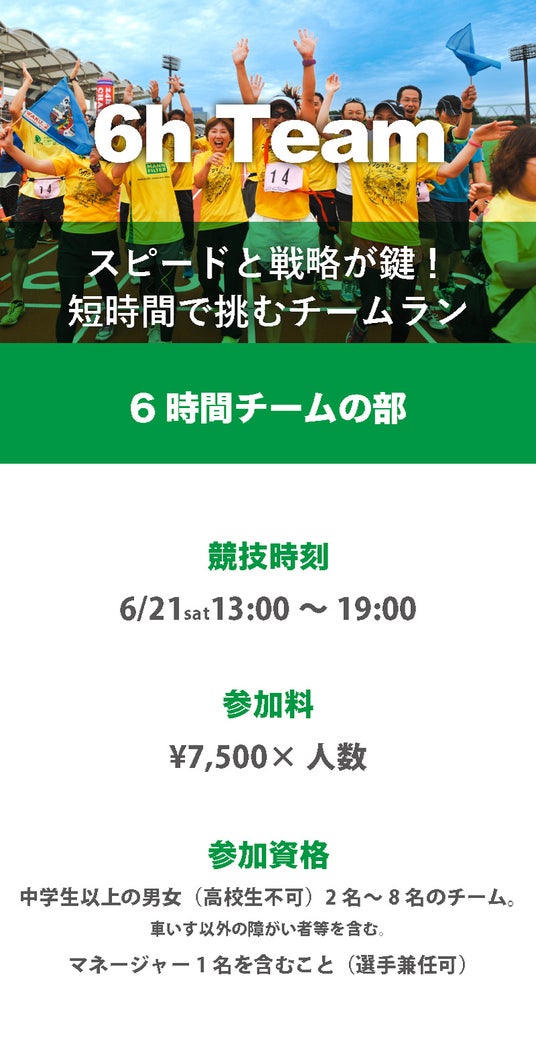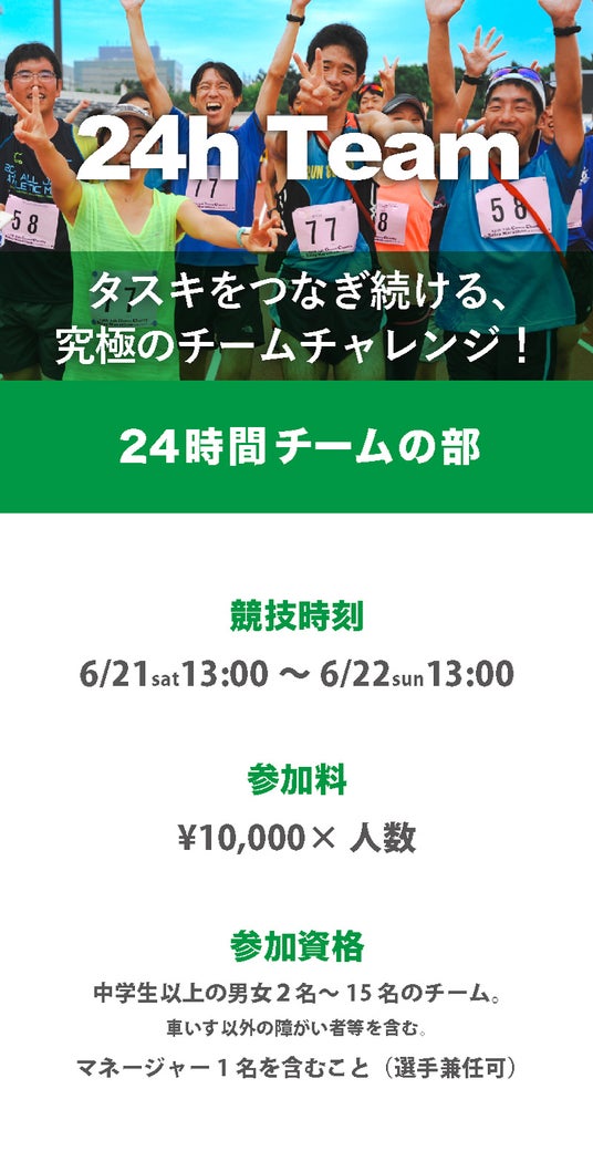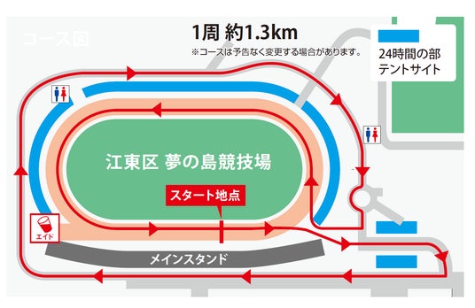 本大会では、24時間チームの部、12時間チームの部、6時間チームの部、4時間チームの部、24時間個人の部をご用意。コースはいずれの部も江東区夢の島競技場内トラックをスタートし、競技場内及び園路約1.3kmを走るほぼ平坦なコースとなっております。