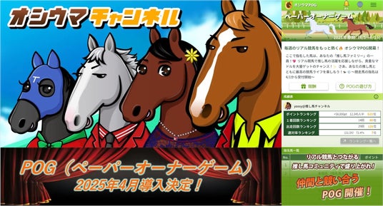 株式会社モブキャストホールディングス(本社:東京都港区、代表取締役CEO:藪 考樹)の子会社であるNINJIN株式会社(本社:同、代表取締役:吉田 安寛)は、競馬ファン向けゲーミングSNS『オシウマチャンネル』(以下『オシウマアプリ』)にて、2025年4月より新機能『オシウマPOG』を提供開始いたします。