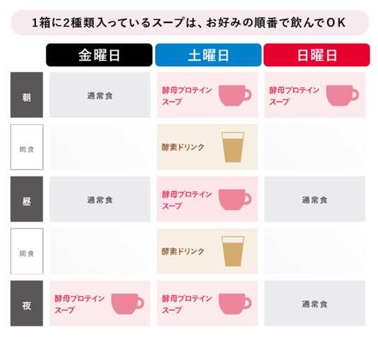 風味豊かな本格的酵母プロテインスープ2種とやさしい甘みの麹菌酵素ドリンクの組み合わせで、おいしくファスティング