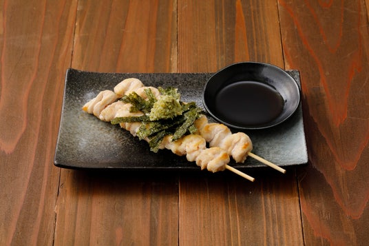 鶏くりから串の白焼~わさび醤油添え~鶏ムネのすじ肉を使った希少部位で、程よい脂とコリコリした食感をお楽しみいただけます。岩塩で焼き上げた白焼は、わさび醤油を付けてお召し上がり下さい