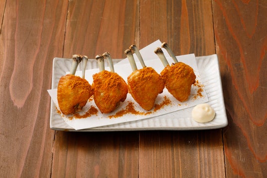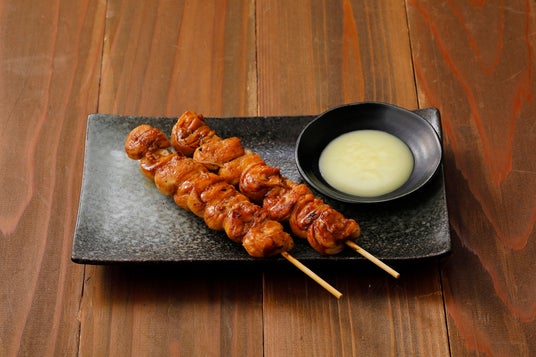 鶏くりから串の蒲焼~バターソース添え~うなぎを串に巻いて焼いた料理「くりから焼き」から着想を得て、鳥貴族らしく鶏肉を使いアレンジ。‟鶏ムネのすじ肉”の部分で、下ごしらえに技術と手間がかかるために、一般には出回っていない希少部位です。程よく脂がのり、コリコリした食感のお肉をお楽しみください。バターソースを付け、お好みで三椒をかけても美味しくお召し上がりいただけます。