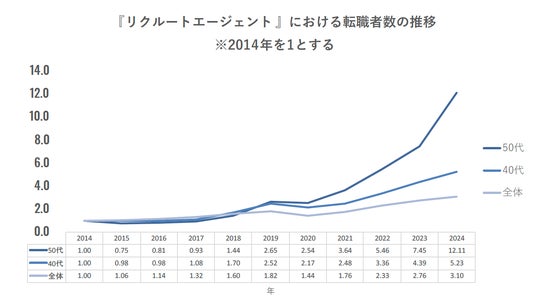 少子高齢化を背景とする構造的な人手不足に加え、企業は事業変革のために豊富な知見・経験を持つ人材を求めており、『リクルートエージェント』の転職者データを分析すると、40代・50代の転職者数の伸びは、全体よりも大きいことが分かる。
