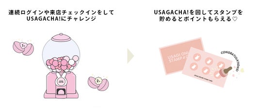 さらに今回のリニューアルで、アプリ連続ログイン・店頭で来店チェックインをすると挑戦できるウサガチャ機能や、スタンプを貯めるとポイントがもらえるスタンプカード機能が追加し、店舗とオンライン相互で購買体験が楽しめるOMO戦略を目的とした新機能を搭載しました。