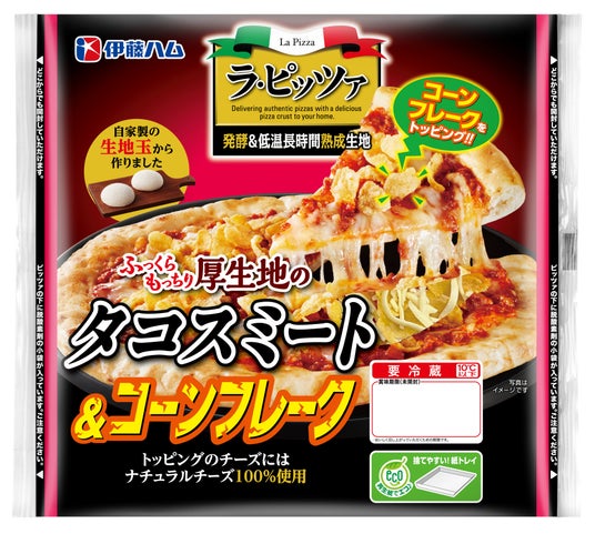 伊藤ハム株式会社は、こだわりの発酵&低温長時間熟成生地の「ラ・ピッツァ」シリーズからタコスミートソースにコーンフレークをトッピングした「タコスミート&コーンフレーク」を発売します。