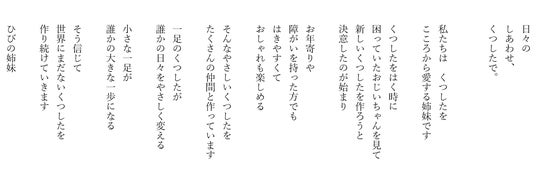 靴下・色・福祉用具の専門資格を持つ代表の(姉)ほのかと、靴下デザイナーの(妹)さやかが、医療・福祉・介護の現場での声を聞きながら、障がいのあるお子さんを持つご家族や専門家とともに開発しました。