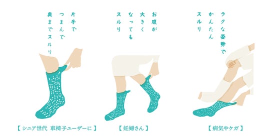加齢、病気やケガ、妊娠中、障がいなどによって靴下の着脱が困難な方の悩みを解決することを目的に開発された靴下です。独自の構造により、片手でも簡単に履くことができる設計で、機能性だけでなくデザイン性にも配慮した商品です。