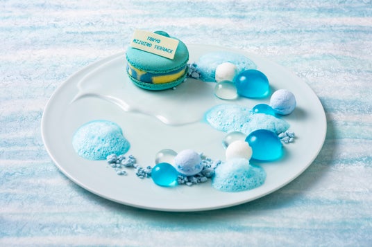 ■デザートプレート-Azure-見た目のインパクトに圧倒される、〆にぴったりなラムネとバニラのマーブルアイスを挟んだ水色の大ぶりマカロンに、レモン風味の水色ゼリーやギモーヴ、ホワイトチョコレート風味のバブルソースなどを添え、見た目も涼しげなデザートプレート。