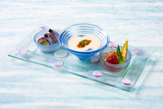 夏の涼を感じられる爽やかなオードブルを詰め込んだ一皿。ポロ葱とジャガイモのほのかな甘みのスープやトマトのジュレでさっぱりと仕上げた野菜と海老の和出汁おでん、透明感のあるライスペーパーに花びらを敷き詰め、生ハムとアボカドをロールした淡い青色ライスロールが登場。