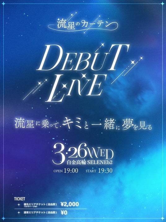 「スターレイプロダクション」と「スターミュージック・エンタテインメント」の新規共同プロジェクトから誕生したアイドルグループ『流星のカーテン』が、3月26日(水)に待望のデビューライブを開催することが決定しました。