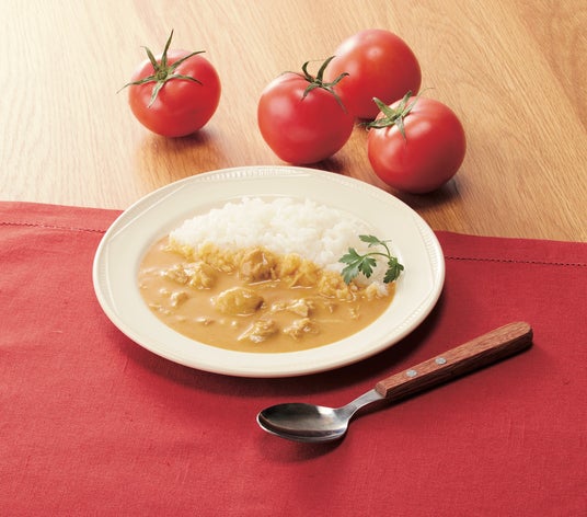 この産地ではトマトのサイズや糖度を上げるため栽培期間中にストレスを与えることから、副次的に流通に適さない規格外トマトが一定数発生していました。そこで、この糖度が高く食味の良い規格外フルーツトマトの果肉をピューレ状に加工したものを使用し、トマトの特性をいかしたバターチキンカレーを商品化。しっかりしたコクの中に、ほのかなトマトの甘さと風味があり、生クリームやバター、ヨーグルト、ローストカシューナッツでコクと旨味を感じるカレーに仕上げています。それでいて重すぎない味わいは、お子様からご年配の方にもお召し上がりいただける一品です。