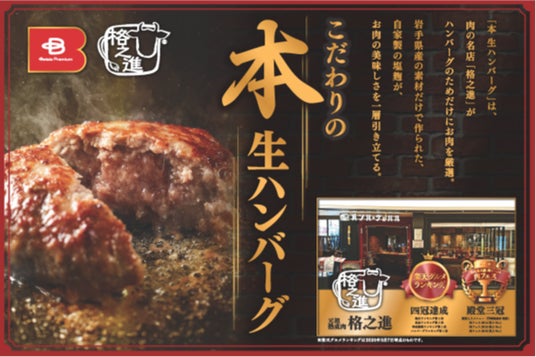 肉の名店 格之進 × ベイシア 共同開発プライベートブランド「Beisia Premium」から肉汁あふれるふんわり食感を目指した肉屋こだわりの冷凍生ハンバーグ「本生ハンバーグ」を3月26日より新発売