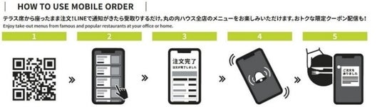 「丸の内ハウスモバイルオーダーエリア」のお好きな席についたまま対象の店舗でテイクアウトメニューを注文できるテーブルオーダーシステム。二次元コードからLINEで友だちを追加後、メニューを選択して注文することができます。商品完成後LINEのメッセージで通知が届くため、丸の内ハウス内のどこにいてもすぐにお呼び出しでき、各店の「TO GOカウンター」で、できたての商品を受け取ることができます。