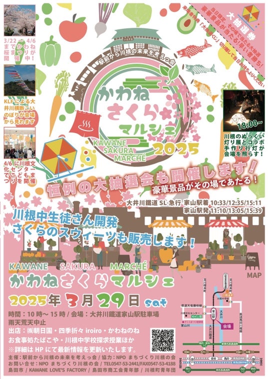 「かわねさくらマルシェ」は2022年から、大井川鐡道の家山駅周辺の桜並木が咲き始める時期に、地域活性のために開催されているイベントで、大井川電機の本社は「かわねさくらマルシェ」会場と同じ家山地区にあります。