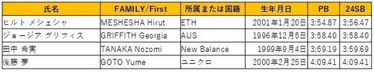 両種目には、日本が世界に誇るトップアスリートがエントリー。男子3000m障害物には、日本記録保持者でオリンピックと世界選手権を通算3大会で入賞を果たした両種目には、日本が世界に誇るトップアスリートがエントリー。男子3000m障害物には、日本記録保持者でオリンピックと世界選手権を通算3大会で入賞を果たした三浦龍司(SUBARU)、女子1500mには同種目をはじめ3種目の日本記録を持ち、東京オリンピックで1500m8位入賞を果たした田中希実(New Balance)が出場予定です。さらに、世界選手権4大会連続出場の男子3000m障害物の青木涼真(Honda)、 パリオリンピック日本代表で2023年アジア選手権2位の女子1500mの後藤夢(ユニクロ)もエントリーが決定しております。