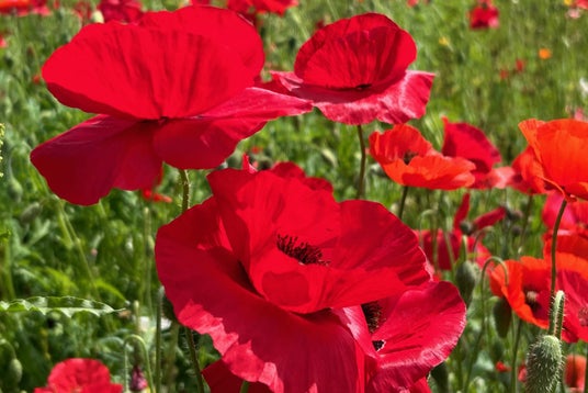 同じ運動広場花畑にて、5月下旬頃にかけて、こぼれ種の赤い「シャーレーポピー」が入れ替わりに開花します。花畑の約1/3エリアでの開花となりますが、引き続きポピーの花をお楽しみいただけます。