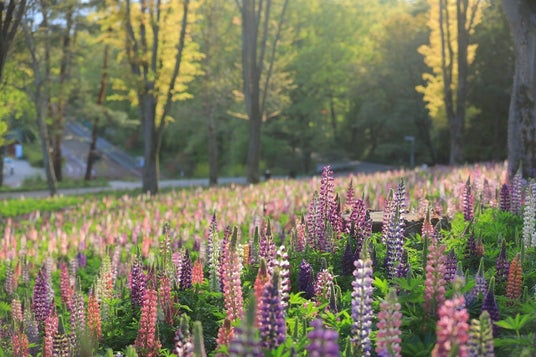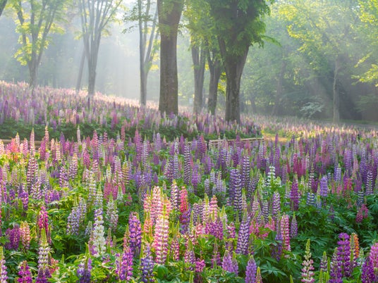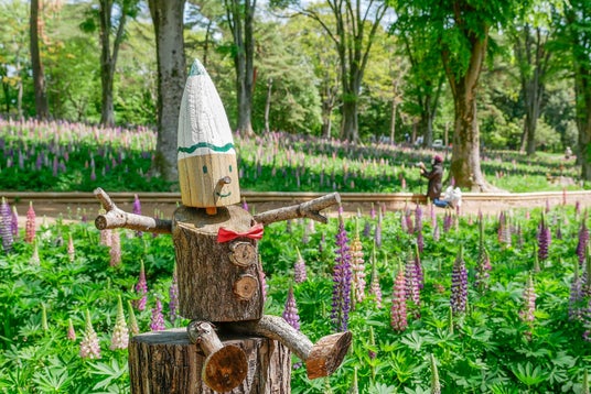 4月下旬からは斜面地に植えられた約4万本の「ルピナス」の花畑も見頃を迎える見込みです。 フジに似た花が下から咲きあがる姿から「ノボリフジ(昇り藤)」の別名もついており、紫・ピンク・白など色が豊富なだけでなく濃淡もある美しい花です。空に向かって咲くルピナスに、ケヤキの木漏れ日が射し、幻想的な景色をお楽しみいただけます。