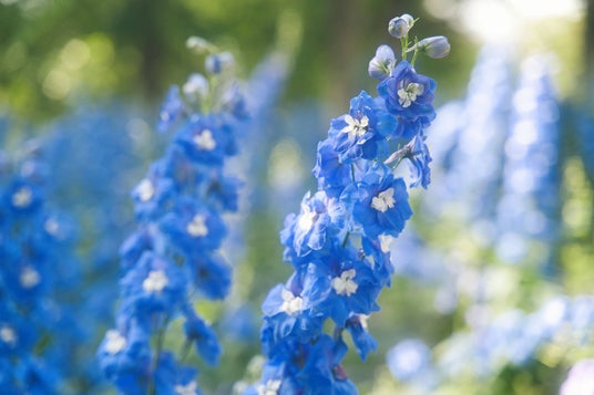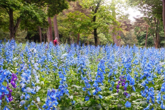 5月上旬からは、さわやかな花色が特徴の「デルフィニウム」の花畑が見頃を迎えます。草丈が大きく成長するのが特徴で、1m以上にもなる大型の植物です。当園では、ブルー系を中心に約10品種を取りそろえており、「青の花畑」としてお楽しみいただけます。