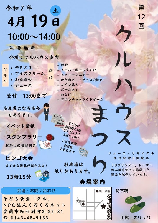2025年4月19日(土)、特定非営利活動法人くるくるネット(所在地:北海道室蘭市知利別町2-22-31)は、地域の子どもたちやそのご家族を対象とした交流イベント「第12回クルハウスまつり」を開催いたします。