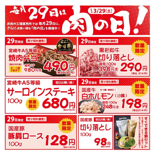 毎月恒例の「肉の日」では、さらにお買い得な商品を多数取り揃えています!