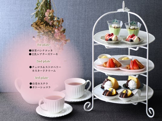 しっとりと優しい甘さの「台湾カステラ」や、春を感じる「抹茶パンナコッタ」、ほんのりビターな濃厚な味わいの「ガトーショコラ」など、和と洋のラインナップをちりばめた、フォトジェニックな3段重ねの『スイーツスタンド』は、まるでスイーツの宝石箱!