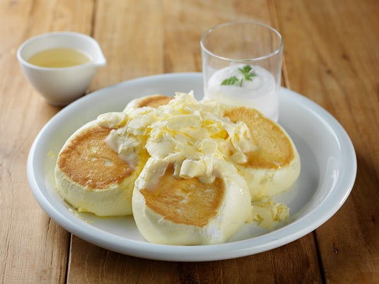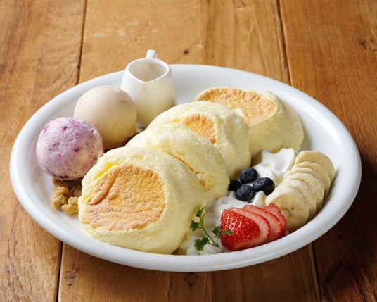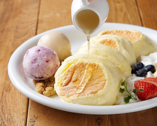 甘酸っぱいヨーグルトブルーベリーアイスと味わい深いバナナアイスの2種類のアイスをトッピング。香り高いはちみつソースをたっぷりとかけて、パンケーキとのマリアージュをお楽しみください。