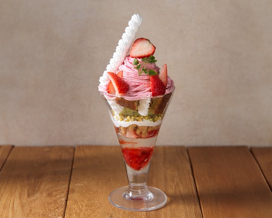 苺の酸味とピスタチオのコクの調和をお楽しみいただける、4月限定パルフェ。