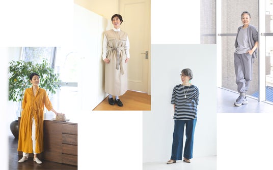 「ヨーガンレール」のプレスを務める武安輝子さん、ベテランパタンナーの鬼塚佐知子さん、ヘアサロン「ホワイトハウス」の寺谷真由美さん、「キーロ・インク」の及川千鶴さんほか、大人の着こなしを極めた6人の、春夏のおしゃれをご紹介。
