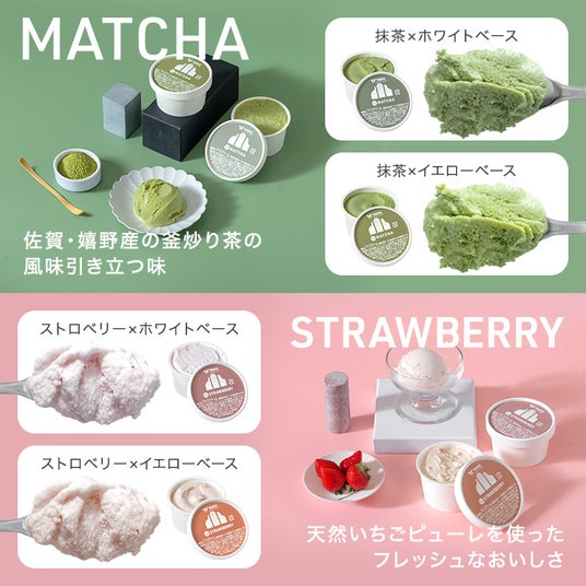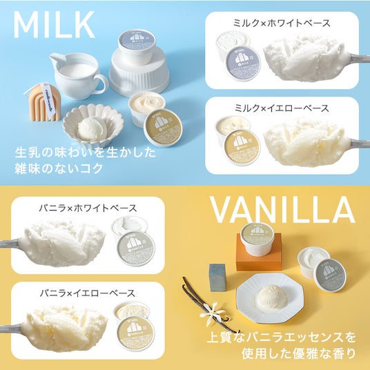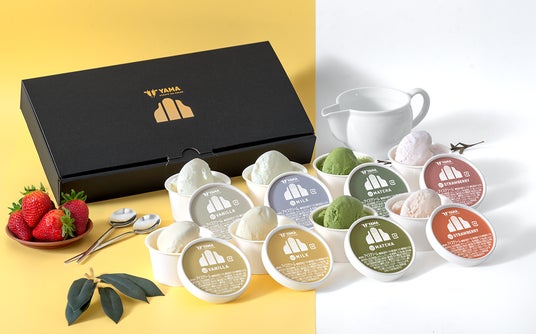 今回発売される「アイス食べ比べセット YAMA」は、卵黄を使用しない「ホワイトベース」と一般的なアイスクリームと同様に卵黄を使用した「イエローベース」の2タイプに、バニラ・ミルク・抹茶・ストロベリーの4つのフレーバーの組み合わせで計8種類のアイスクリームのセットとなっております。どのフレーバーも牛乳のおいしさを感じるテイストに仕上げつつ、フレーバーの違いを楽しめるセットとなっております。