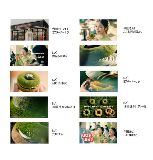 今回の新TVCM では、ミスタードーナツの店舗で友人と宇治抹茶づくしを楽しむ今田さんが、祇園辻利の味わいに引き込まれていく姿が堪能できます。ミスタードーナツで味わえる祇園辻利の「宇治抹茶づくし」、「宇治抹茶 栗あずき」、「ポン・デ・ダブル宇治抹茶」、「ポン・デ・ザク宇治抹茶 きなこ」、「ポン・デ・宇治抹茶 黒糖わらびもち」の5 つの商品の魅力を訴求していきます。