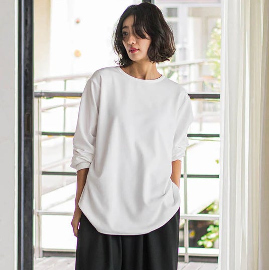 カットソーでありながら、まるでブラウスのような上品さ。一枚でもサマになる、ゆるいフォルムで抜け感を演出。単体ではもちろん、レイヤードのインナーとしても活躍します。