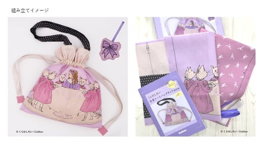 イラストがプリントされた生地をカットして、説明書通りにパーツと縫い合わせていくと、おしゃれな巾着トートとかわいいチャームが作れるキットです。