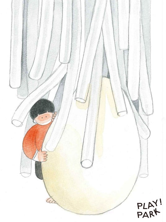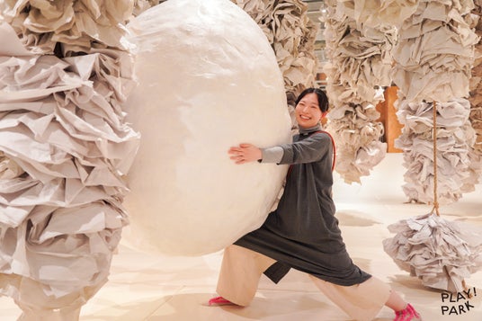 土木建築用シーラントバックアップ材「ミナフォームマルマル(R)」を約3,500本使用し、天井から吊るすことで、資材が真っ白な森へと生まれ変わります。軽量で弾力性・復元性に優れた特性を活かして制作した遊具は、かきわけたり、顔をのぞかせたり、ロープにまたがってターザン遊びができます。さらに、お皿の中に転がっている大きなたまごと一緒に森の中を探検してみると、また違った楽しみ方ができます。