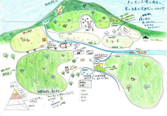 以下の図は、牧場の未来予想図です。酪農を中心としながらいちご農園や、田んぼ、畑、ブドウ園をつくり、この土地でできた恵みを頂くレストラン、宿泊施設をつくりたいと考えています。