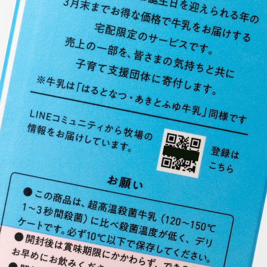 この度、パッケージリニューアルに加え、これまで通り美味しい牛乳を毎日の食卓にお届けし、成長期のお子さまの健康な体づくりを応援するだけでなく、新たに「こそだて応援牛乳」利用者専用の公式LINEを設け、LINEの配信を通して子育て世帯に有益な情報の発信や「こそだて応援牛乳」利用者限定のイベント(有料)の募集を行うサービスを開始します。