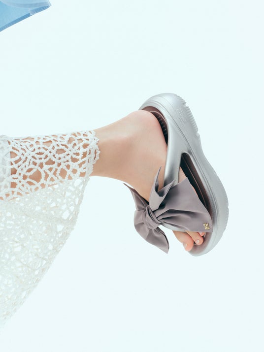 「TAW&TOE」で大人気のIVORY・SILVER・BLACKに加え、「FRAY I.D」の別注カラーL.BLUEが登場。透明加工を施し、パールのような高級感のある艶感と女性らしい透明感を実現した一足に。