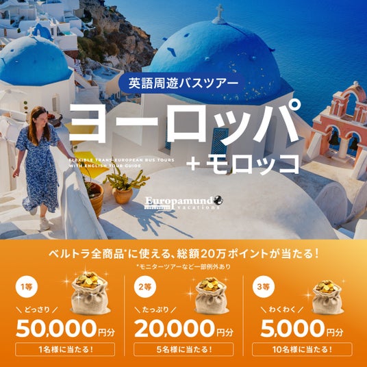 現地体験型アクティビティ専門予約サイト『ベルトラ』を運営するベルトラ株式会社(本社:東京都中央区、代表取締役社長:二木 渉)は、ヨーロッパムンドバーケーションズ社協賛のもと、ヨーロッパ周遊バスツアーの魅力を伝える共同プロモーションを開始いたしました。特設サイト「英語周遊バスツアーで行く ヨーロッパ+モロッコ」の公開にあわせて、ベルトラポイントが総額20万円分当たるキャンペーンを実施いたします。