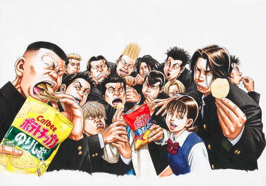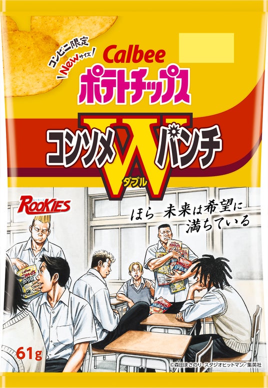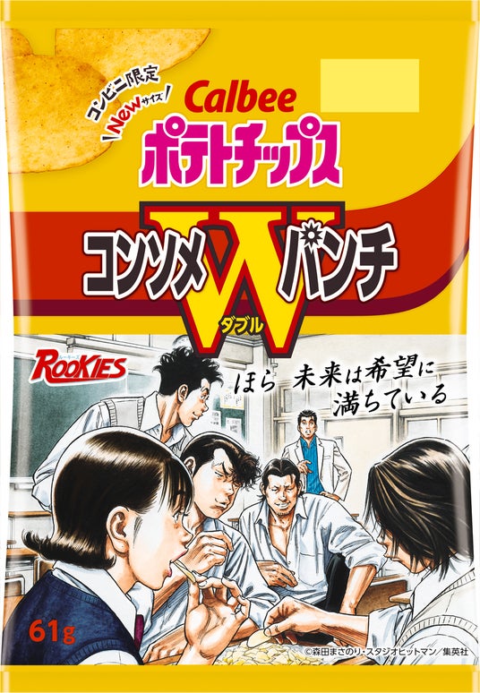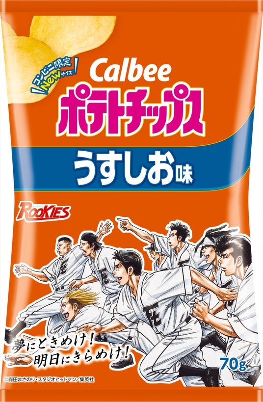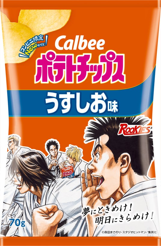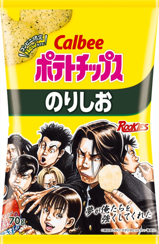 コンビニ限定サイズの「うすしお味」「のりしお」「コンソメ W パンチ」の 3 品で漫画『ROOKIES』とのコラボ レーションパッケージを期間限定で展開します。当商品のために作者・森田まさのり氏が描きおろしたデザイン は、「夢にときめけ明日にきらめけ ver.」(うすしお味)、「夢が俺たちを強くしてくれた ver.」(のりしお)、「ほら 未来は希望に満ちている ver.」(コンソメ W パンチ)の 3 つです。さらに期間中、パッケージ裏面に記載の二 次元コードを読み取ると、漫画『ROOKIES』のほかにも『ろくでなし BLUES』などの森田まさのり氏の作品が一部 無料でお楽しみいただけます。コラボレーションパッケージは 2025 年 3 月 31 日(月)より発売します。(2025 年 4 月下旬終売予定。終売後は通常のパッケージになります。) 「カルビー ポテトチップス」は、夢にきらめき、明日にときめく日本中の「ルーキー」達を応援します。