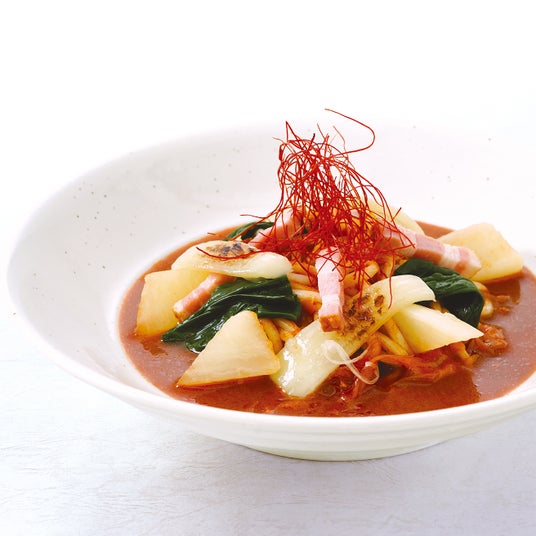 新メニュー3.厚切りベーコンと大根のガーリックチリ 1,520円 (税込) 新鮮なトマトのソースをベースに和のうま味出汁と合わせました。ジューシーな厚切りベーコンの旨みと、大根のシャキシャキした食感が楽しめる贅沢な一皿です。香ばしいにんにくとピリ辛の唐辛子がアクセントになり、シンプルながらも奥深い味わいに仕上が
