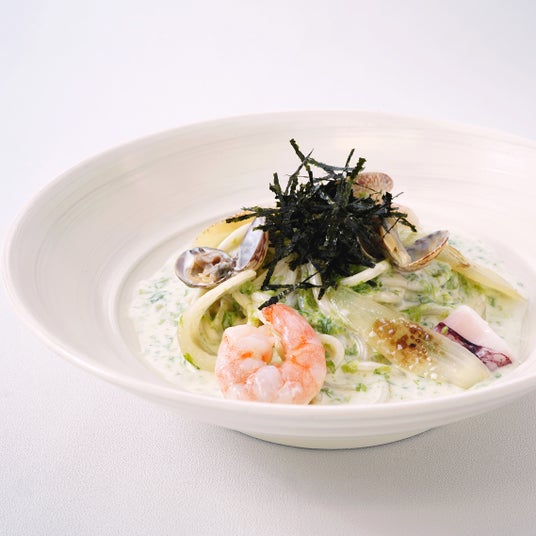 新メニュー2.海鮮と青のりの出汁クリーム 1,520円 (税込) 淡路島牛乳とクリームの濃厚な味わいが特徴的です。アサリやヤリイカ、エビなどの魚介と青のりの香り溢れる一品です。