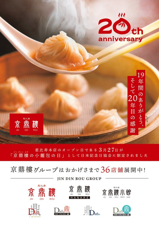 株式会社 JIN DIN ROU(本社:東京都品川区、代表取締役 荻巣雄太)は京鼎樓(ジンディンロウ)20周年を記念して『小籠包 キッズ無料祭り』を開催いたします。