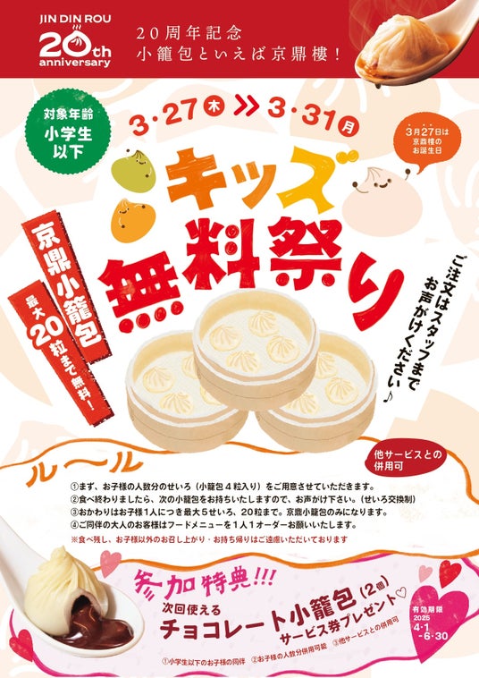20周年の感謝の気持ちを込めて。2025年3月27日(木)~ 2025年3月31日(月)『小籠包 キッズ無料祭り』を開催!!