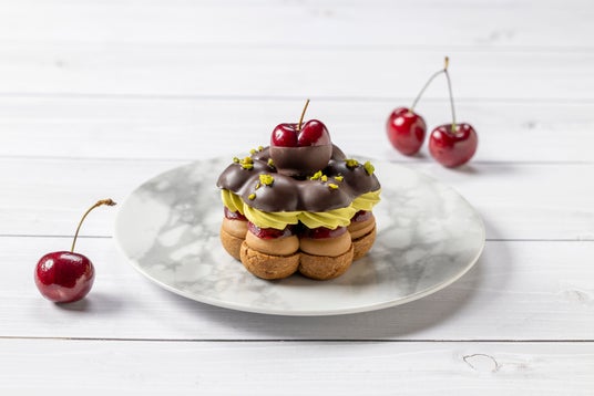 絶妙な甘酸っぱさに仕上げた自家製のグリオットチェリージャム、チョコレートカスタードクリーム、フレッシュのアメリカンチェリー、ピスタチオクリームを、チョコレートでコーティングしたシュー生地でサンドします。みずみずしく甘美なチェリーや風味豊かなピスタチオと、シュー生地のサクっとした食感を、チョコレートのハーモニーとともにお楽しみください。
