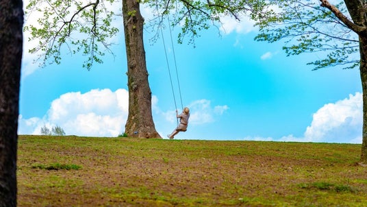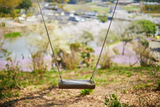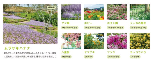 ムラサキハナナと藤棚に囲まれた東屋。ハイジの気分が味わえる森の中のブランコ。鳥たちのさえずりが響く花やさと山。