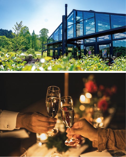 ガラス張りの温室レストランから、筑波山に沈む夕日とマジックアワーを眺めながら、レストラン ローズファームハウスの木下料理長が茨城の旬を詰めこんだ、見て、食べて、楽しい6 品のコースを味わって。