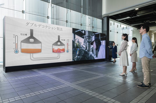 仕込工程では、見学ツアーの見所のひとつであるガラス張りの仕込室の前に大型モニターを新設し、「ザ・プレミアム・モルツ」のこだわりの製法をダイナミックな映像とともにご紹介します。またパッケージング工程では、3面スクリーンを設け、まるで参加者が缶になったかのような目線で製造ラインを体感できる映像を新しく加えました。映像の後は実際の製造ラインをご覧いただけます。