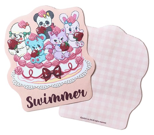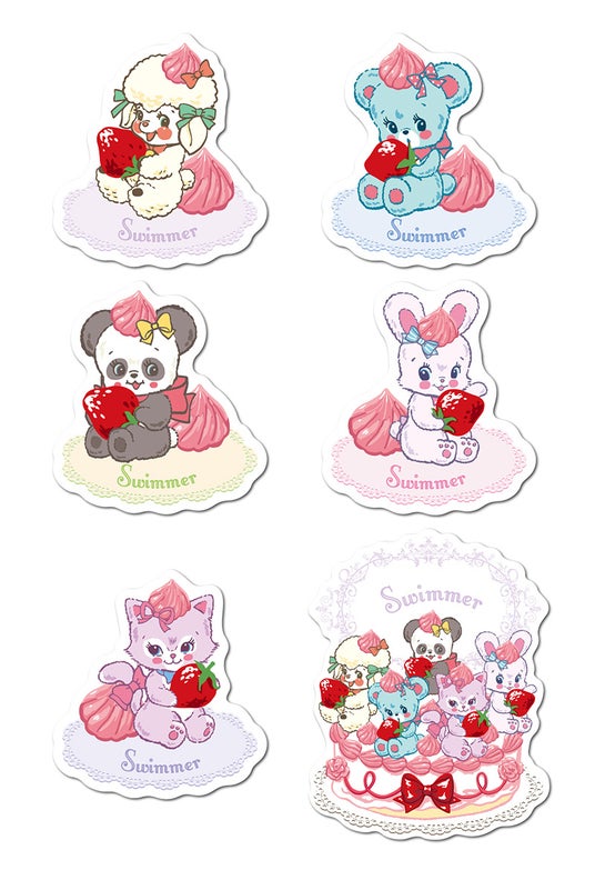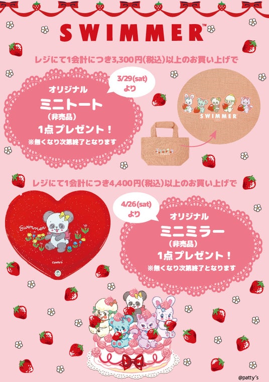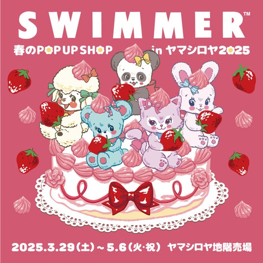 SWIMMERは2021年から毎年、春にヤマシロヤでのPOP UP SHOPを開催しており、今年で5回目!今春はSWIMMERの人気4キャラクターに新しい仲間を迎え、イチゴのケーキでお祝いです(ハート)