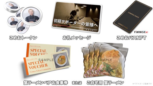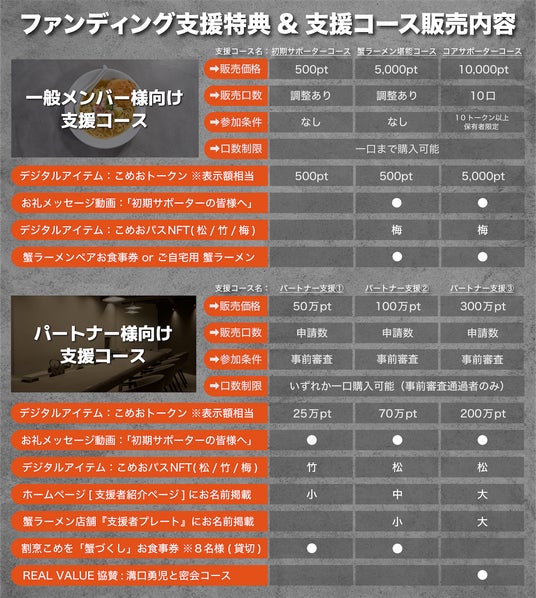 今回のファンディングの目玉はもちろん蟹ラーメン!一足先に”噂の一杯”を味わうことができる貴重な機会をお見逃しなく。このほかにも、メンバーシップNFT「こめをパスNFT(仮)」の配布や、「割烹こめを」を貸切で楽しむことができる「蟹づくし(コース料理)」や、REAL VALUE協賛による「密会コース」の提供など、ファンならずとも必見のリターン※2が目白押しとなっております。詳細はファンディングページに記載の内容をご確認ください。