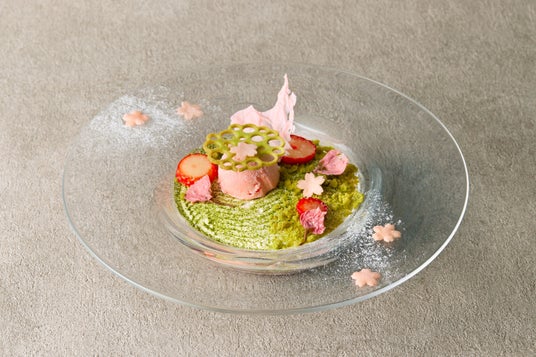 苺のマリネと練乳のパンナコッタ、桜あんのクリームの上に、桜葉香る抹茶パウダー、苺とヨーグルトのシャーベットをのせて日本の石庭をイメージした桜の優しい風味を味わえるパフェ。