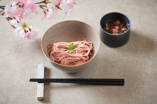 桜の花が浮かぶお出しをかけて香りを楽しみながらいただく『桜そば』。